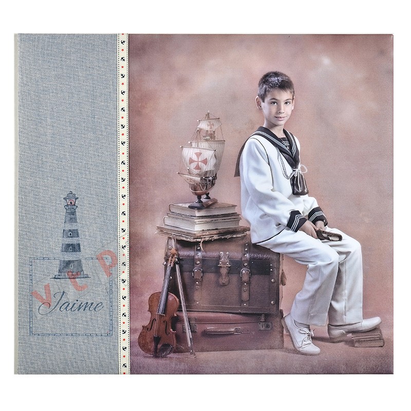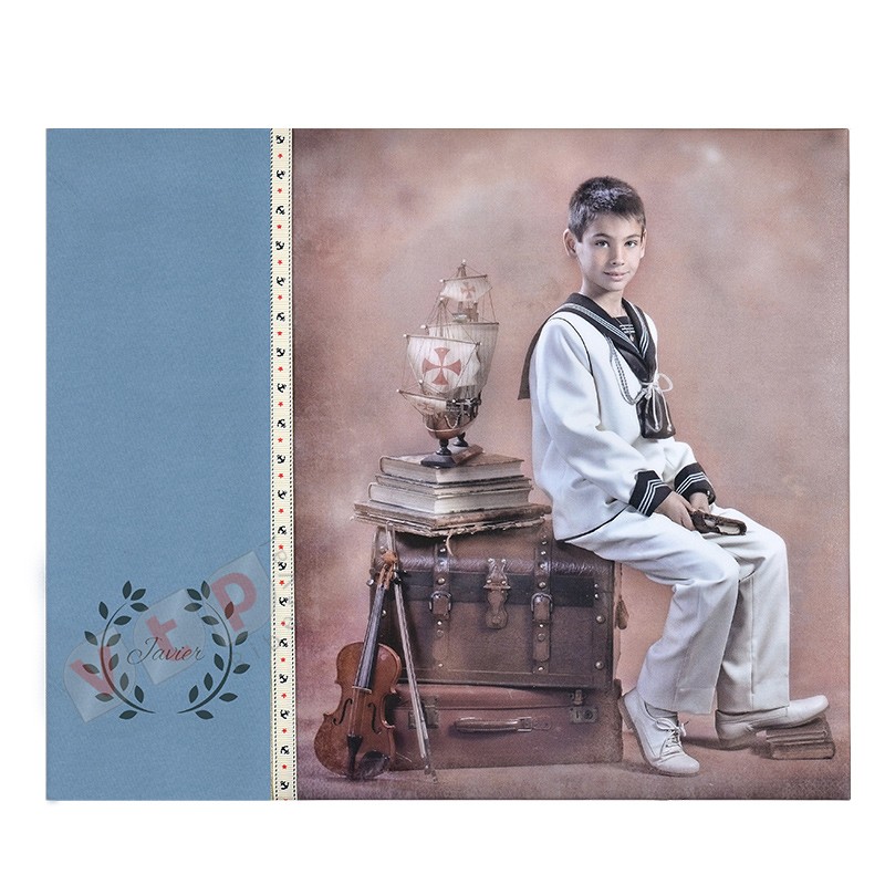 Álbum de comunión con fotografía vertical para personalizar con el material, cinta, alegoría o nombre que desee para que consiga en modelo que más le guste.